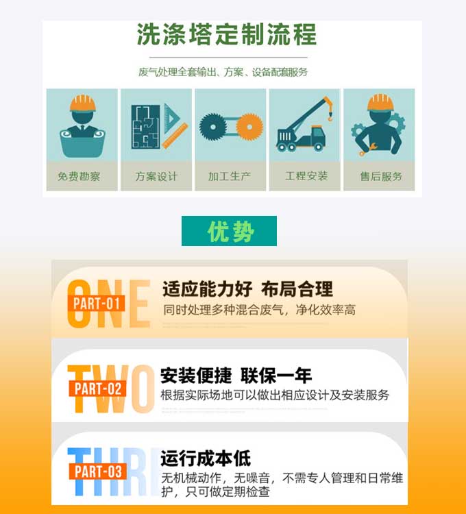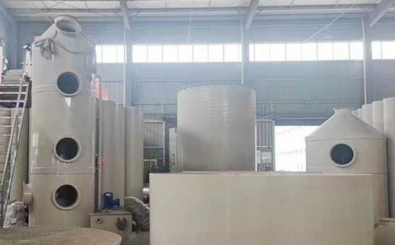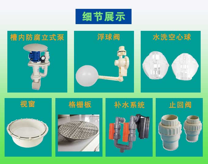 3、在填料表面氣液兩相充分接觸、吸收和中和,以吸附廢氣中的酸性或堿性污垢。凈化后的酸霧廢氣經(jīng)除霧器脫水除霧,凈化后的氣體由風(fēng)機排入大氣,吸收液經(jīng)噴淋塔底水泵加壓后在塔頂噴淋,后返回塔底循環(huán)使用。