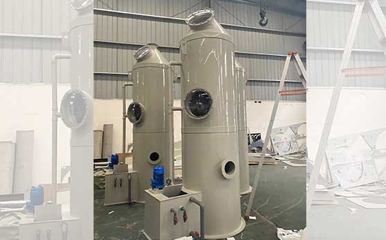 廢氣通過集氣罩預(yù)先收集,在風(fēng)機的作用下連續(xù)輸送至凈化設(shè)備,再通過通風(fēng)管的輸送作用輸送至系統(tǒng)噴淋塔。氣體在設(shè)備中用酸洗液噴淋、洗滌,廢氣中易產(chǎn)生異味的氣體組分與酸性細水霧充分接觸、混合并中和,形成良好的氣液交叉。噴霧后,細水霧在洗滌器內(nèi)的填料層中形成具有大孔接觸面的處理層,進一步處理有機廢氣。
